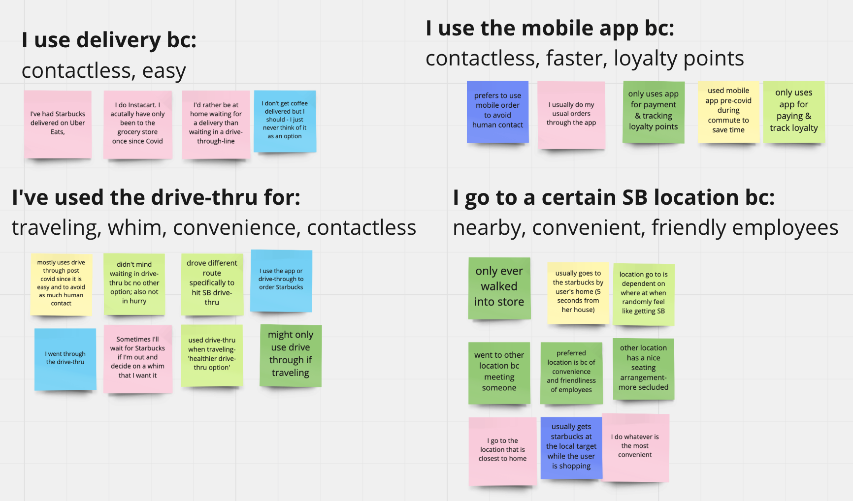 We conducted six user interviews with Starbucks customers. We wanted to know how their behaviors had changed during COVID and what their concerns were. From affinity mapping insights, we learned: