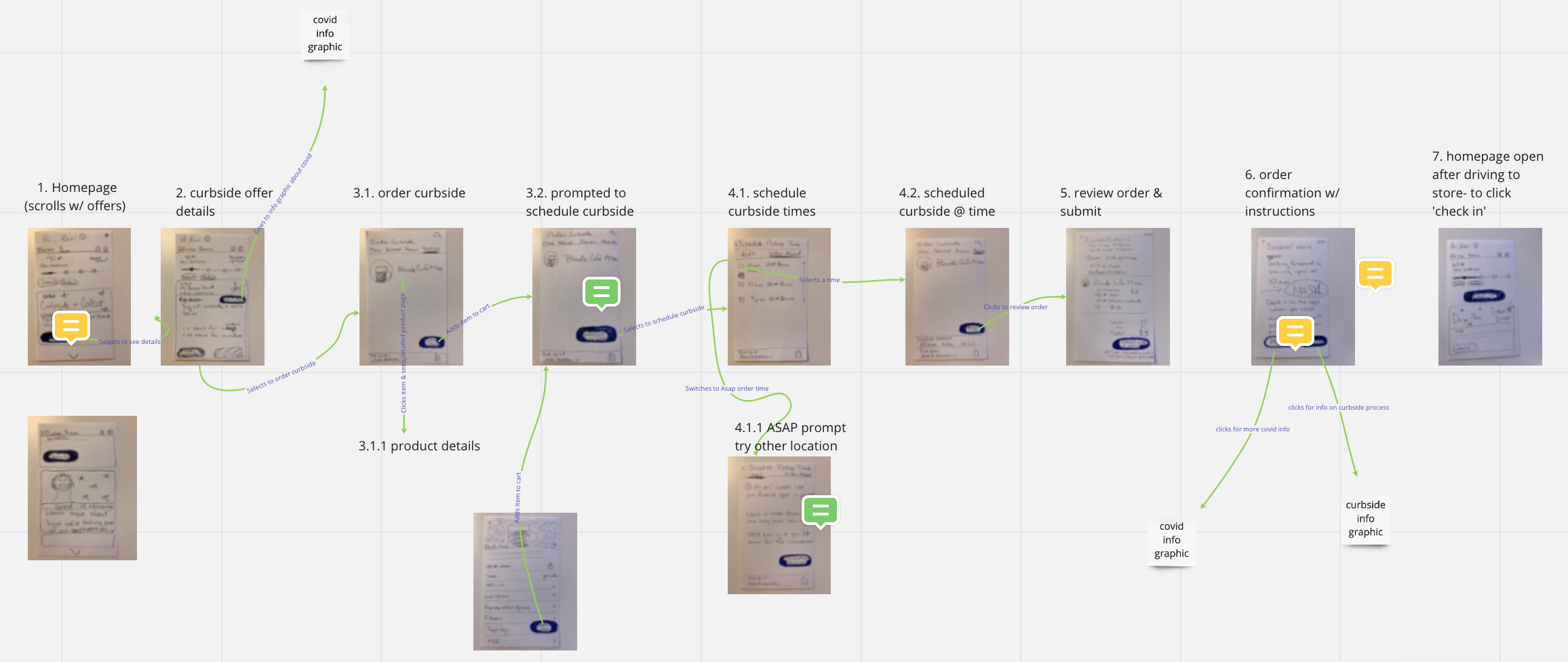 I took screenshots of the individual screens during the task analysis of the curbside mobile ordering process. In Miro as a group, we critiqued those screens and used them as a basis for revising the new user flow.